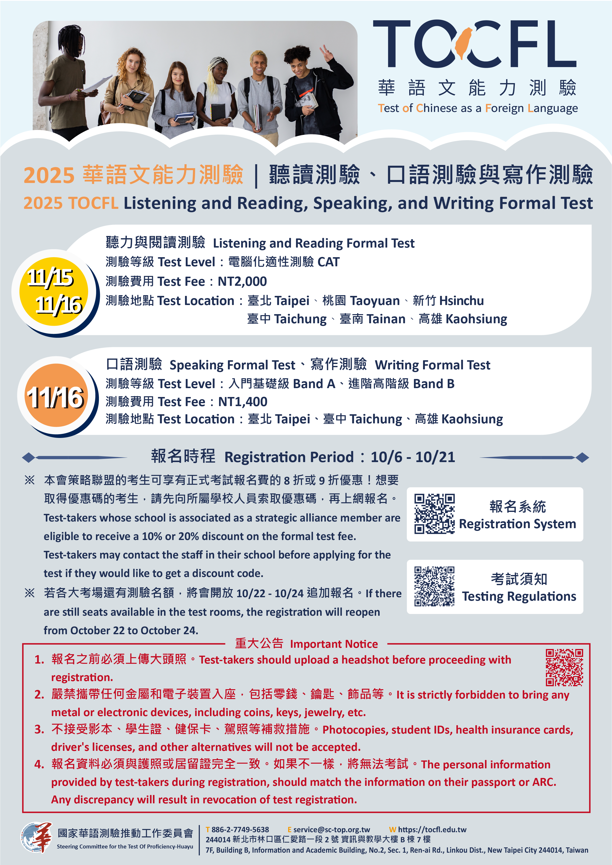 - Test-takers enrolled in programs for overseas Chinese and international students designated by the Ministry of Education (MOE) or the Overseas Community Affairs Council (OCAC) will receive a 50% discount.