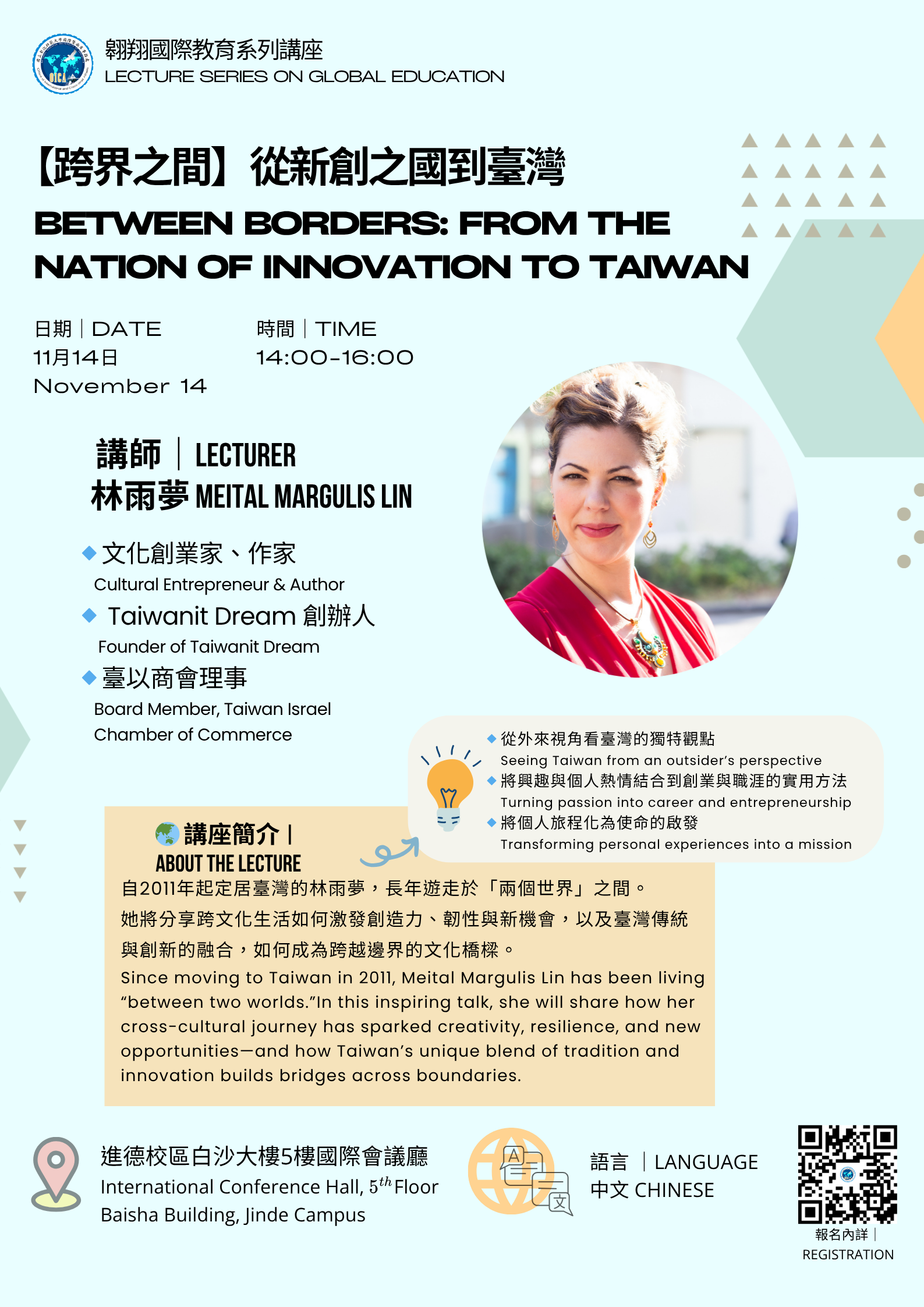 A cultural entrepreneur, writer, and board member of the Taiwan-Israel Chamber of Commerce, Meital Margulis Lin is the founder of Taiwanit Dream Ltd., a cross-cultural platform that connects Taiwan and the world through travel, education, and business. Residing in Taiwan since 2011, she has transformed her personal journey into a professional mission—to build bridges between Taiwan and the world. She frequently shares her insights on cultural intelligence, business culture, branding, entrepreneurship, and creative education at universities and international forums in both Taiwan and Israel.