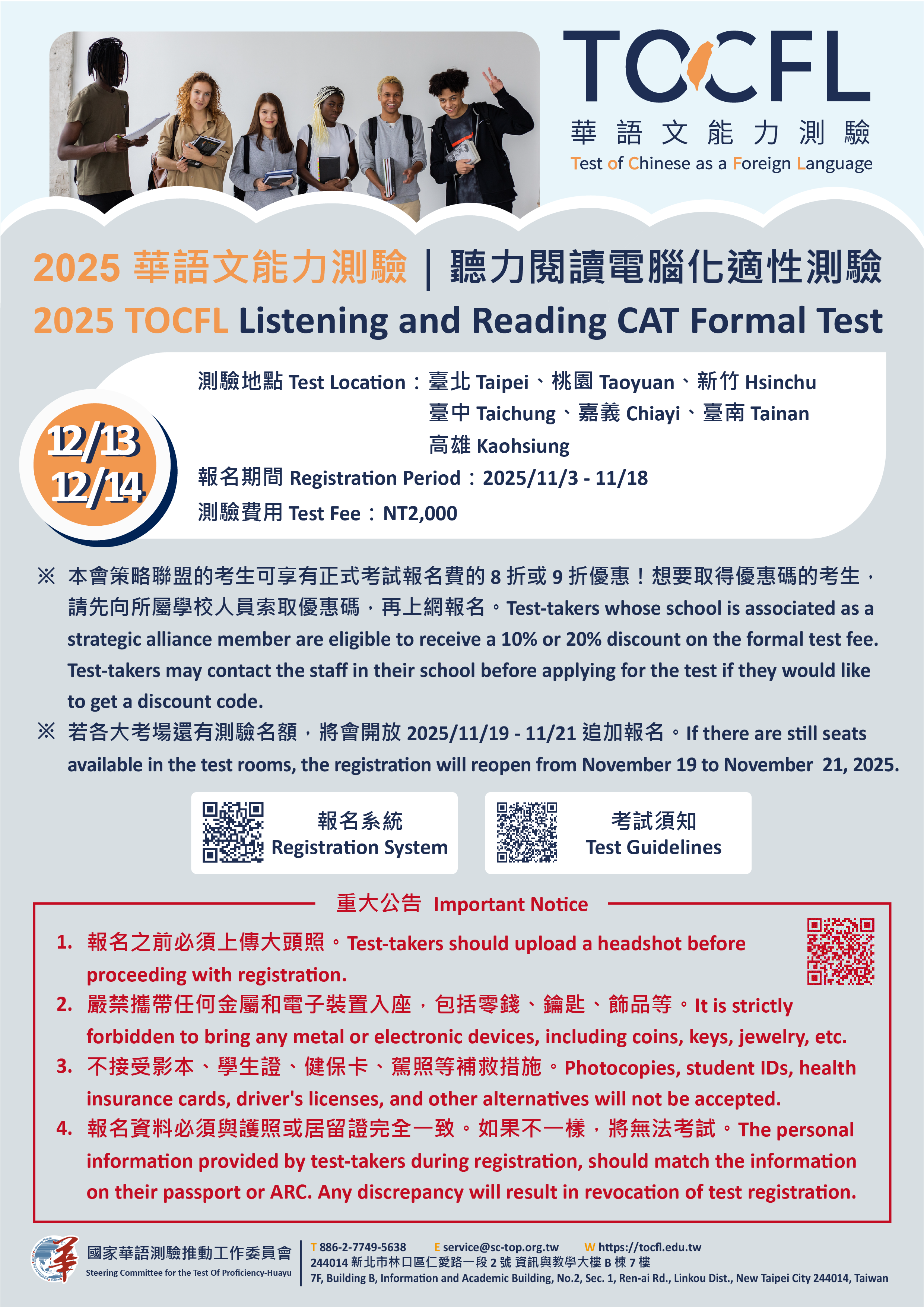 TOCFL華語文能力測驗將於2025年12月13-14日舉行全國正式考試,歡迎母語非華語之人士報考。座位有限,請儘早報名!考試資訊如下: