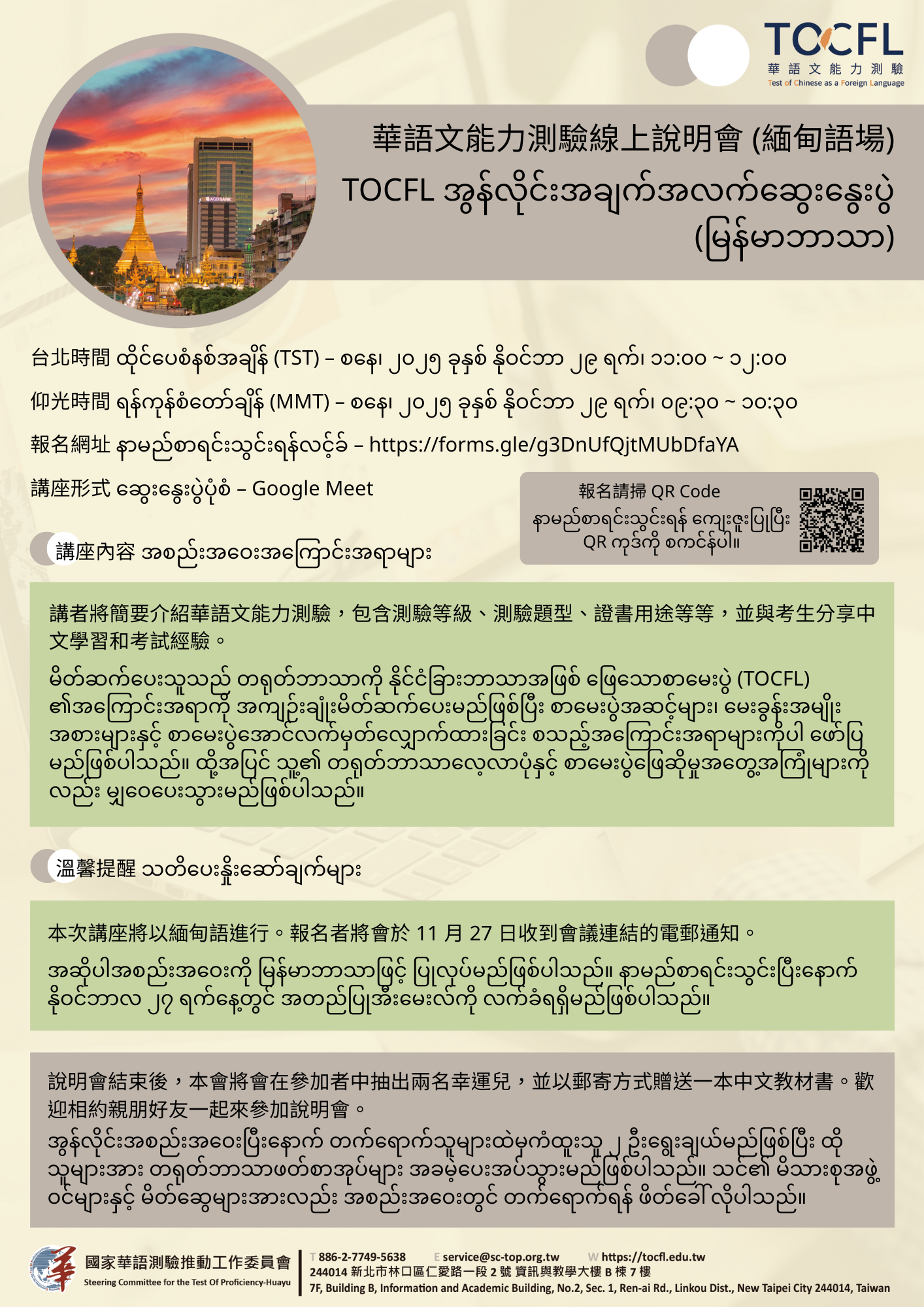 【華測會】華語文能力測驗線上說明會 (緬甸語場) TOCFL အွန်လိုင်းအချက်အလက်ဆွေးနွေးပွဲ (မြန်မာဘာသာ)
