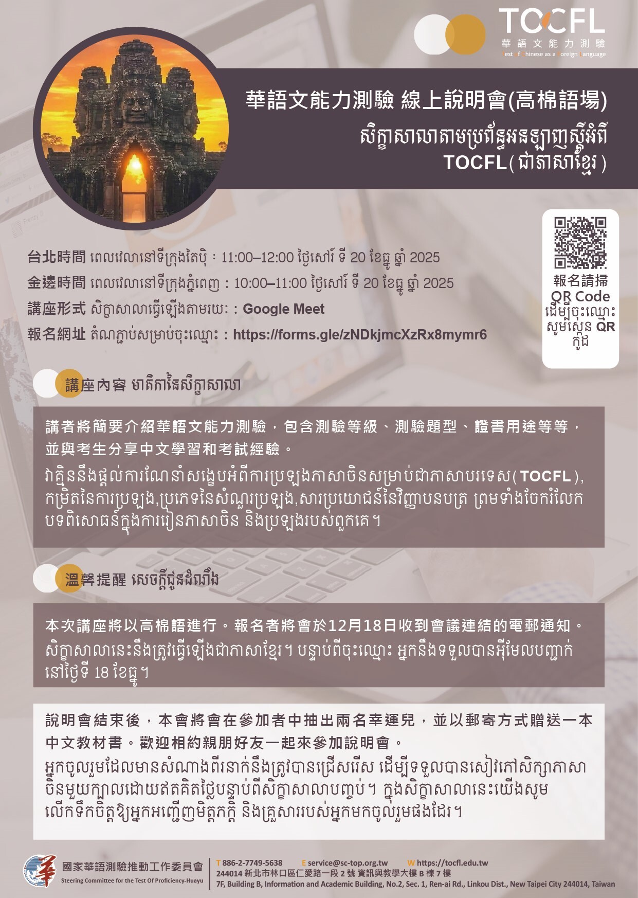 【華測會】2025年12月20日 (六) 華語文能力測驗線上說明會(高棉語場)សិក្ខាសាលាតាមប្រព័ន្ធអនឡាញស្តីអំពី TOCFL (ជាភាសាខ្មែរ)