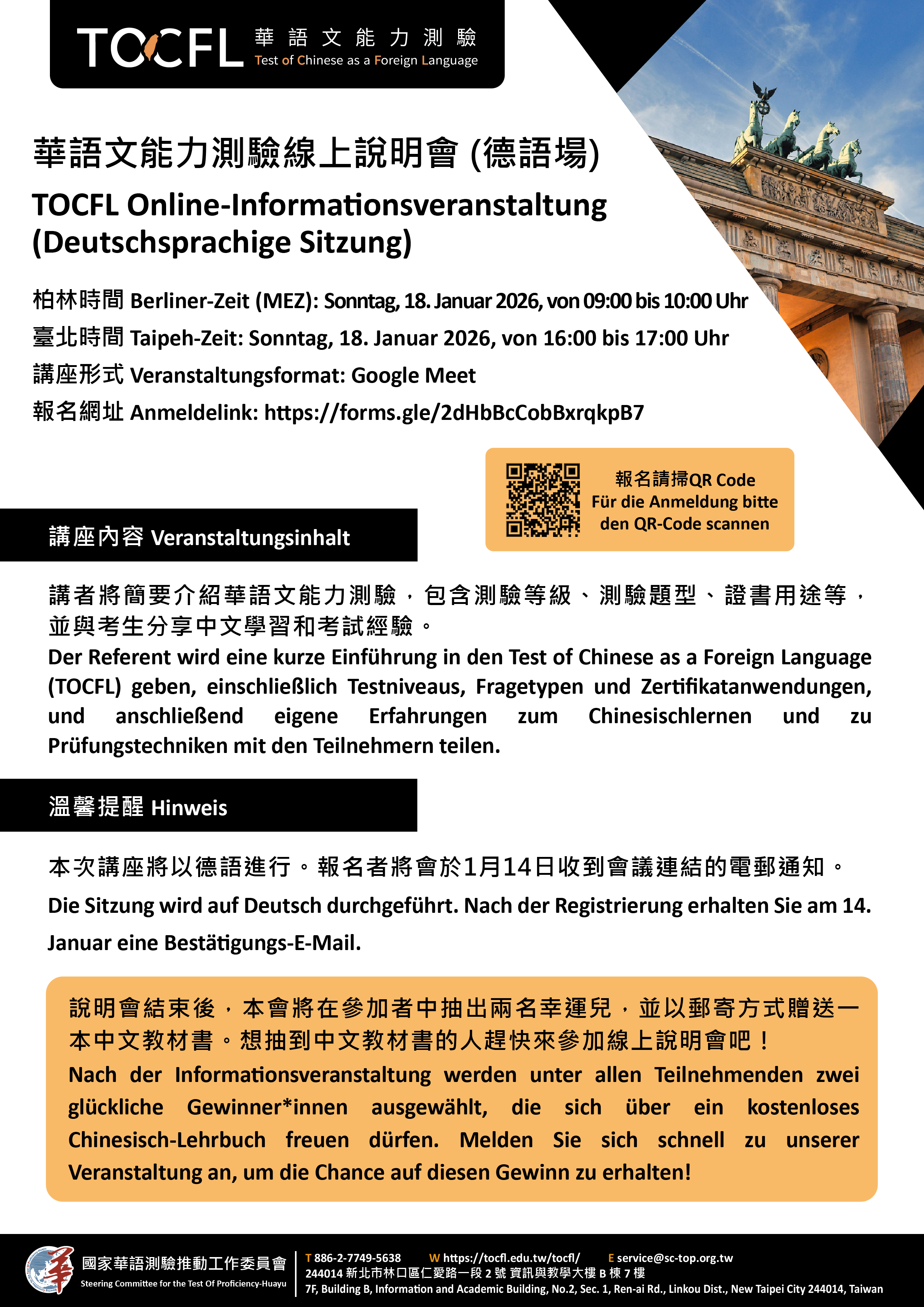 【華測會】2026年1月18日華語文能力測驗線上說明會 (德語場) TOCFL Online-Informationsveranstaltung (Deutschsprachige Sitzung)