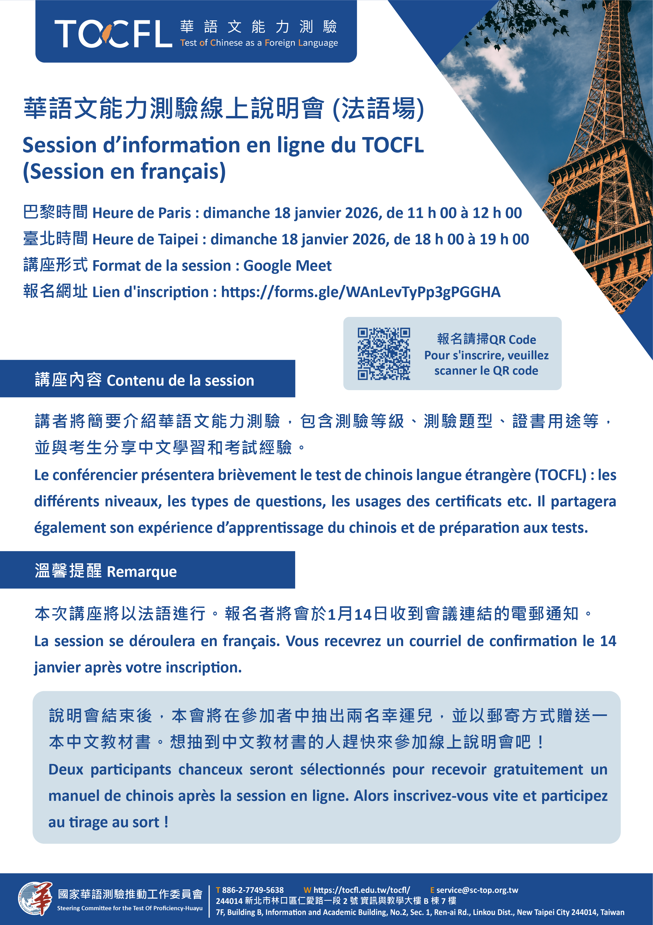 【華測會】2026年1月18日華語文能力測驗線上說明會 (法語場) Session d’information en ligne du TOCFL (Session en français)