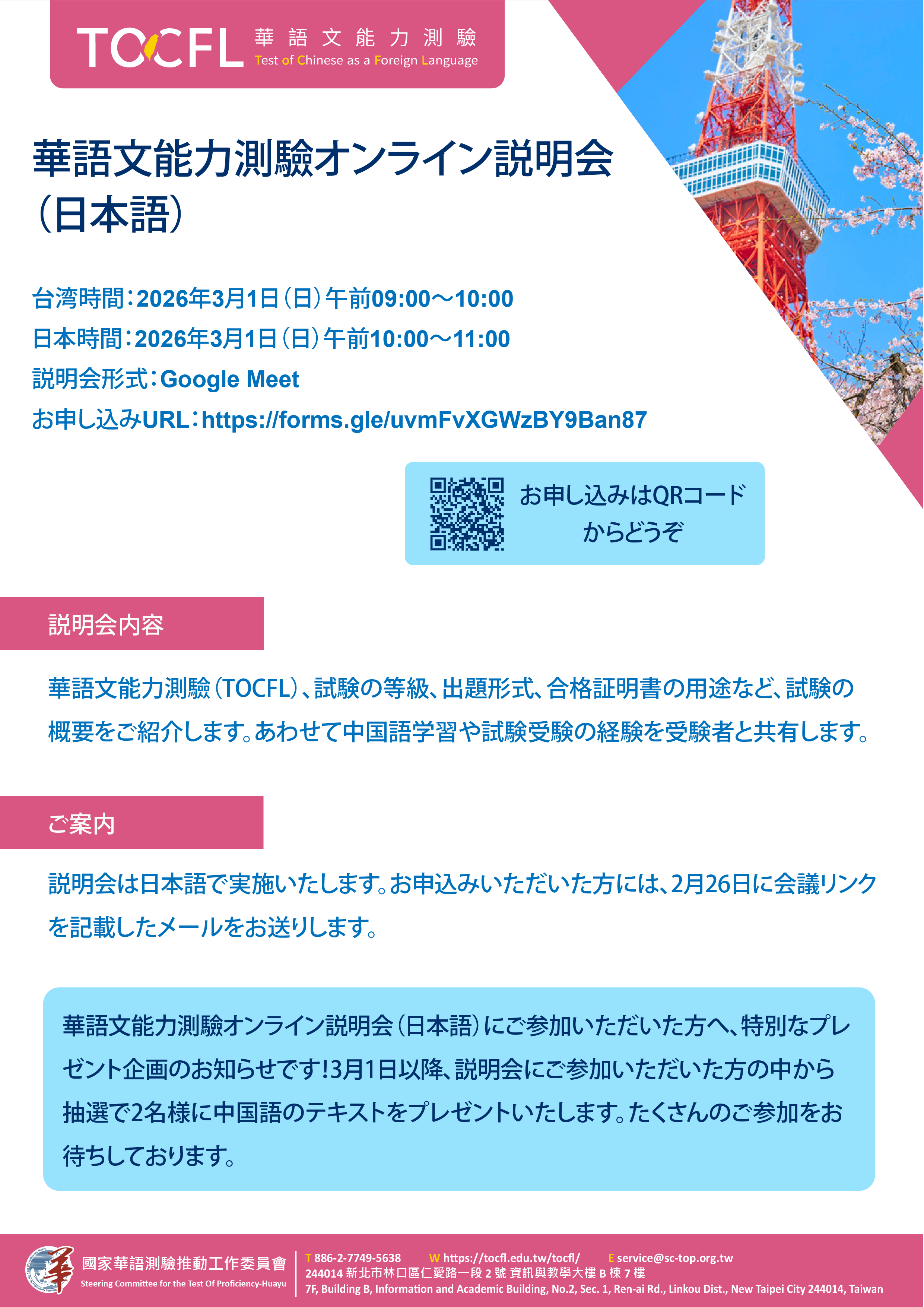 華測會將於 3/1 (日) 針對母語為日語的考生們舉辦一場華語文能力測驗線上說明會,歡迎學生踴躍參加,以下為說明會資訊: