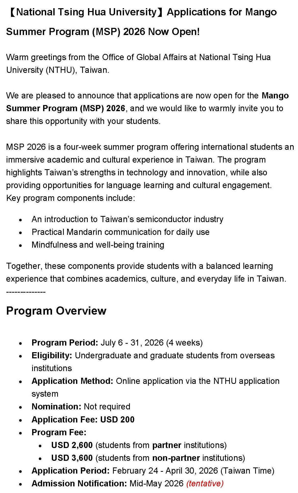 【轉知】國立清華大學 Mango Summer Program (MSP) 2026